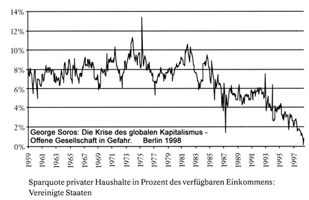 Was auch immer passiert, entscheidend fuer die schwere der Folgen ist die soziale Stabilitaet eines Landes. Diese wurde aber, vor allem in den USA, durch den Casino Kapitalismus deutlich geschwaecht. Anfang 1996 beleuchteten Business Week und New York Times ("The Downsizing of America") das Problem. Bei einer arbeitenden Bevoelkerung von 120 Millionen leben in den USA 50 Millionen an oder unter der offiziellen Armutsgrenze. Eine Stiftung, die Suppenkuechen fuer Armenspeisungen fuer 10% der Bevoelkerung unterhaelt, berichtete wonach im Jahre 1995 27% ihrer Besucher berufstaetig waren. Sie hatten trotzdem nicht genug zum Leben. Gleichzeitig sind mehr als 100 Millionen Amerikaner besorgt, dass ihr gesammtes Familien Einkommen nicht die Ausgaben deckt. Da sah auch Soros.